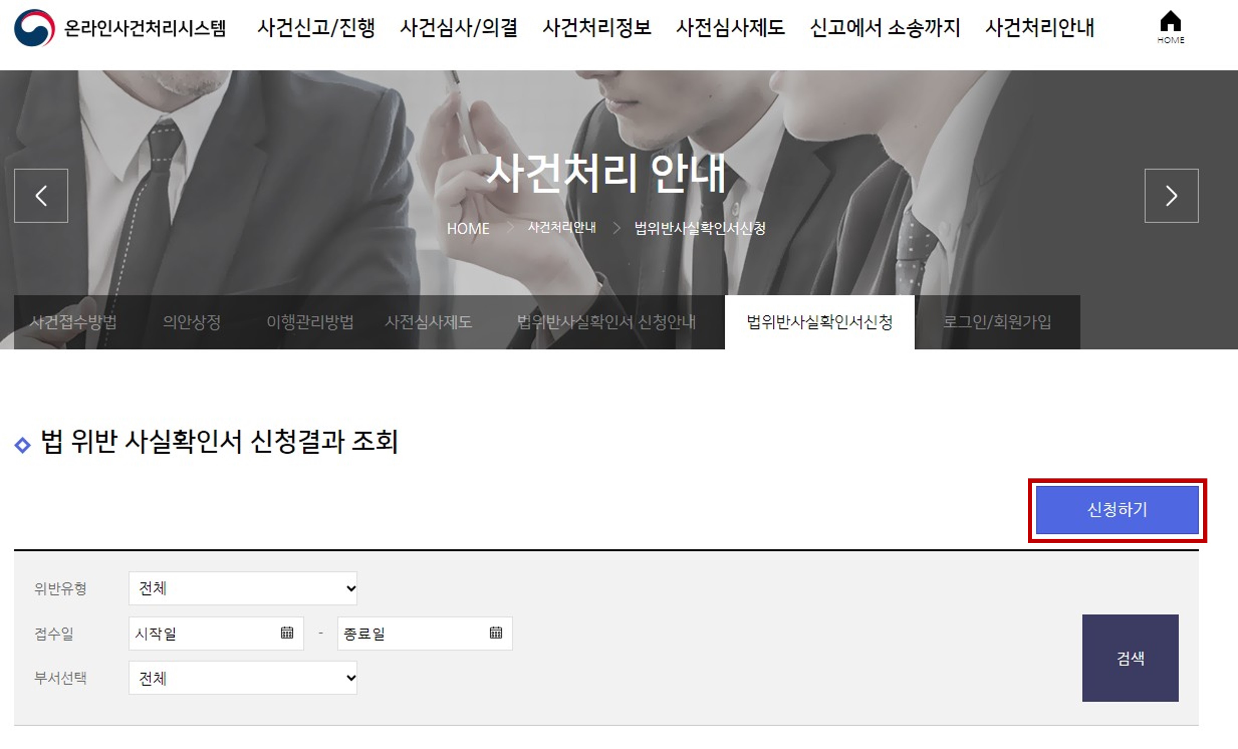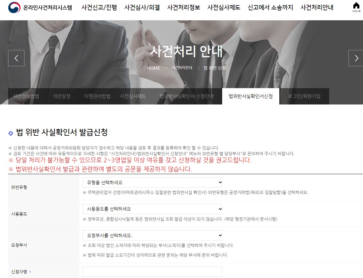 그리고 나서 4개의 대메뉴 중 법위반 사실확인서 신청을 누르면 됩니다.