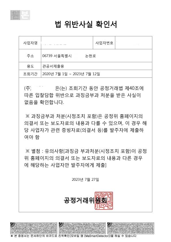 법위반사실확인서는 업체의 공정거래법, 하도급법, 표시광고법 위반 사실을 담당 공무원이 확인하고 조회 기간 중 법 위반 사실이 없는 경우를 증명하는 문서입니다.