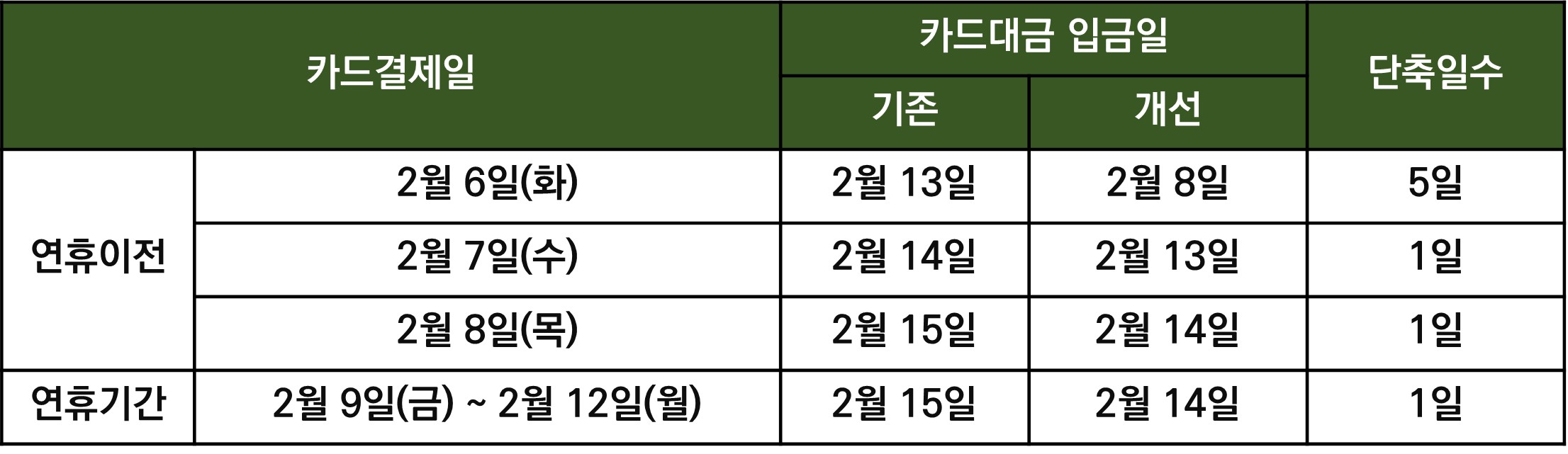 또한, 카드 가맹점 대금도 선 지급될 예정입니다. 카드 업계는 중소 카드 가맹점에 대해 최대 5일 먼저 가맹점 대금을 지급하게 됩니다.