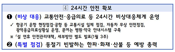 정부는 설 연휴 기간 교통안전 및 응급의료 대응을 위한 24시간 비상대응체계를 운영합니다. 문 여는 병의원과 약국 정보를 제공하고, 산불, 한파 등 동절기 재난 예방에 총력을 기울입니다.