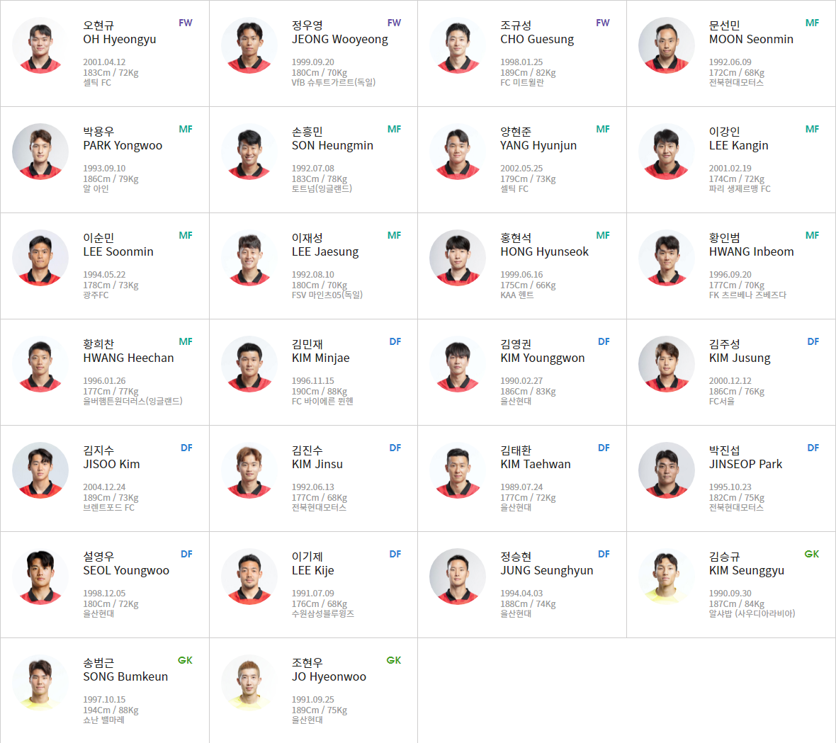주장 손흥민(토트넘훗스퍼)을 비롯해 김민재(바이에른뮌헨), 이강인(파리생제르맹), 황희찬(울버햄튼), 이재성(마인츠05), 조규성(미트윌란), 황인범(즈베즈다) 등 해외에서 활약하는 선수들이 대거 소집되었으며, 이 외에도 국내에서 꾸준한 활약을 보인 선수들도 대표팀에 그대로 소집되었습니다.